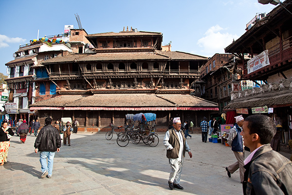 Kavindrapur Tempel. Rechts een deel van de Singha Sattal en linksboven het dakterras van het Kastamandaprestaurant.